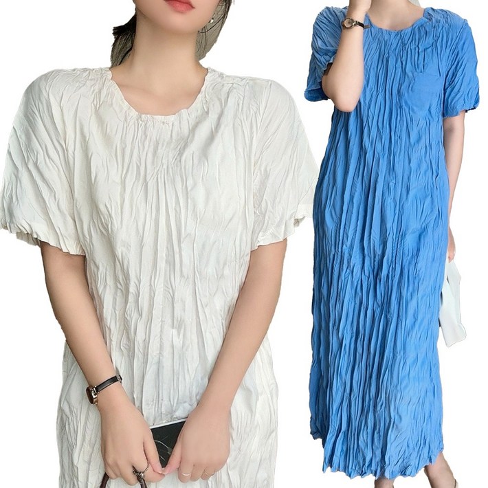 와이오모드 여름 플리츠원피스 반팔 쭈글이 막 주름 롱 원피스