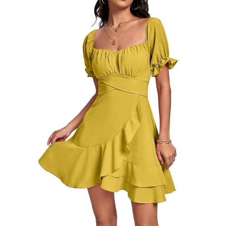 LYANER 여성용 스퀘어 넥 러플 랩 미니 드레스 오프 숄더 플라운스 반소매 A라인 하늘거리는 드레스, 퓨어 네이비 블루, XL 150153