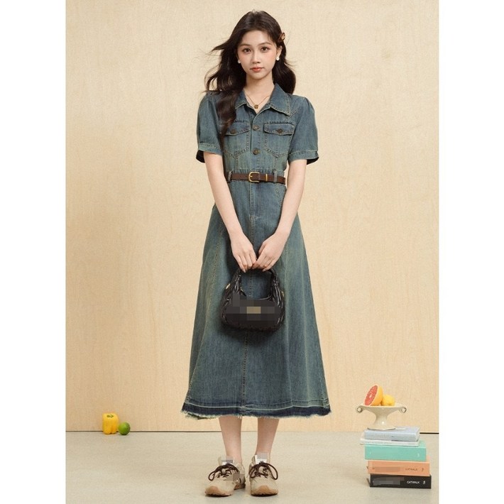 옷깔난다 모던 카라 A라인 데님 원피스 롱기장 반팔 청원피스 벨트 포함 라리즈원피스